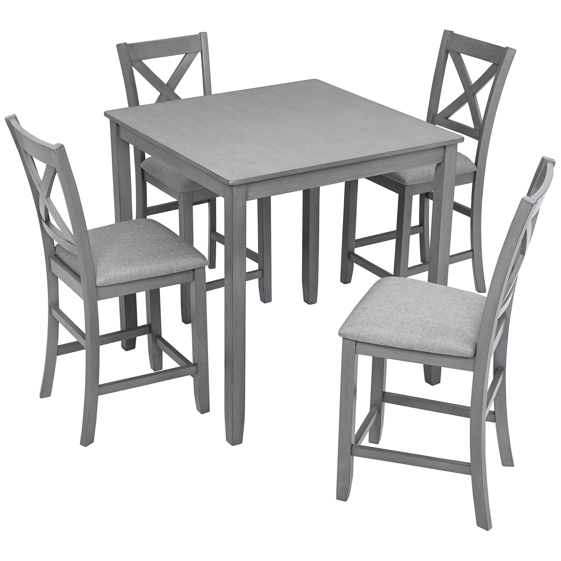 5 Piece Dining Table Set, Wooden Dining Square Table Set For 4, Counter Height Kitchen Table Set With Square Table And 4 Upholstered Chairs For Small Space - Gray