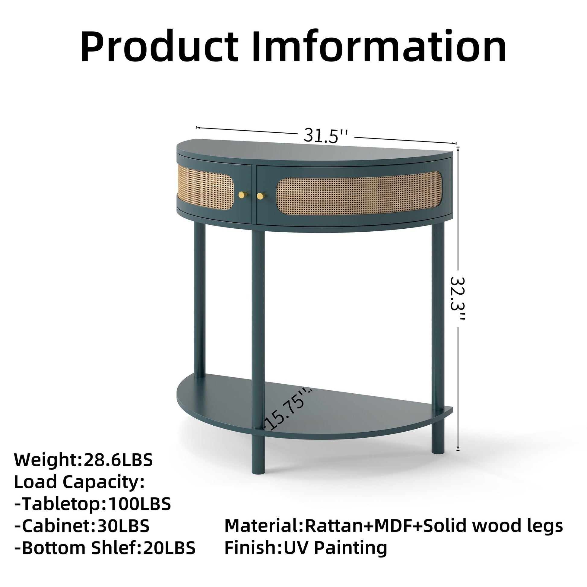 Boho Rattan Semi Circle End Table With Sliding Rattan Door, Elegant Entryway Console With Storage And Bottom Shelf - Antique Green
