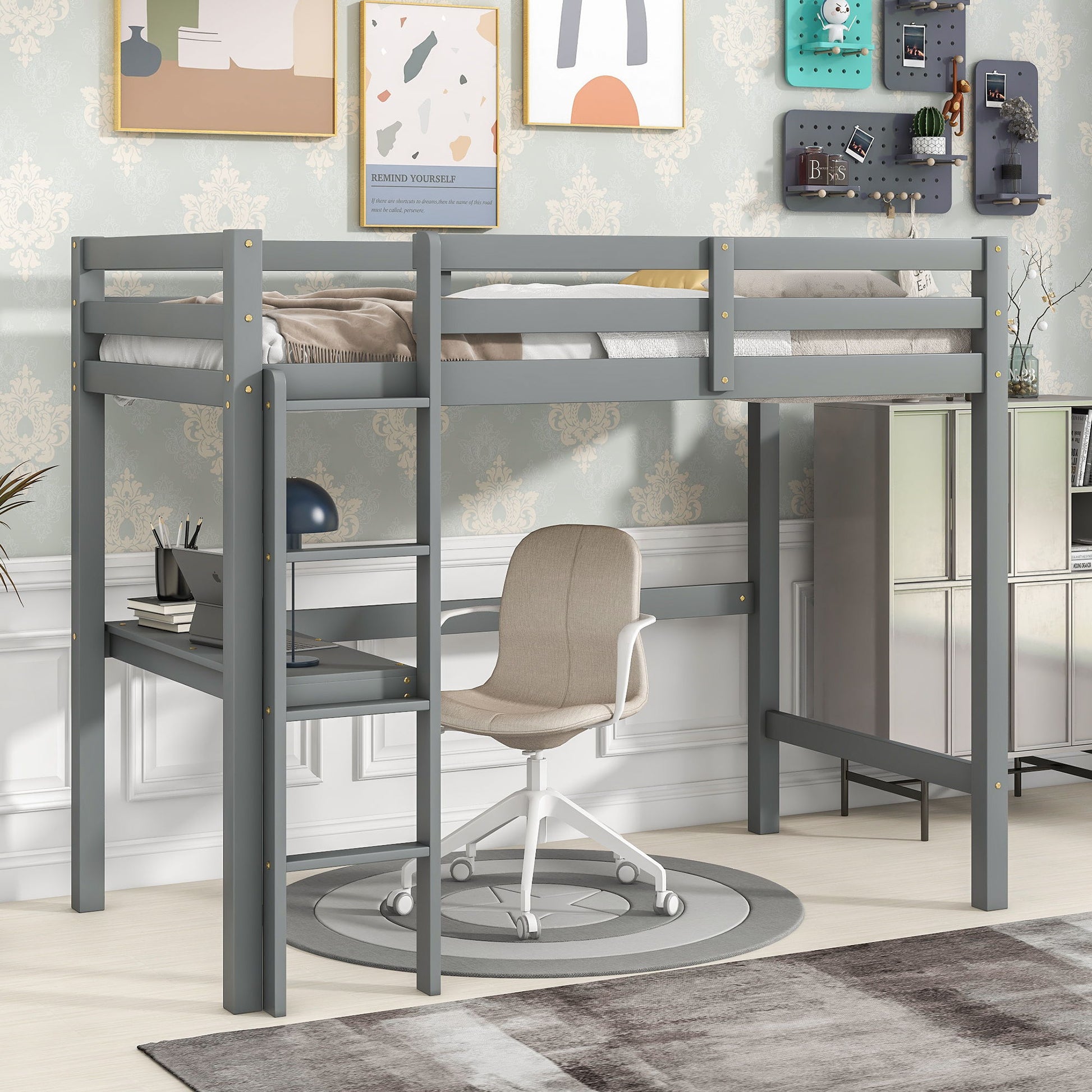 - Comprehensive Design: Built for sturdiness and safety, the loft bed includes a desk for a quiet reading space and a wide, secure ladder for easy access to the upper bunk.
