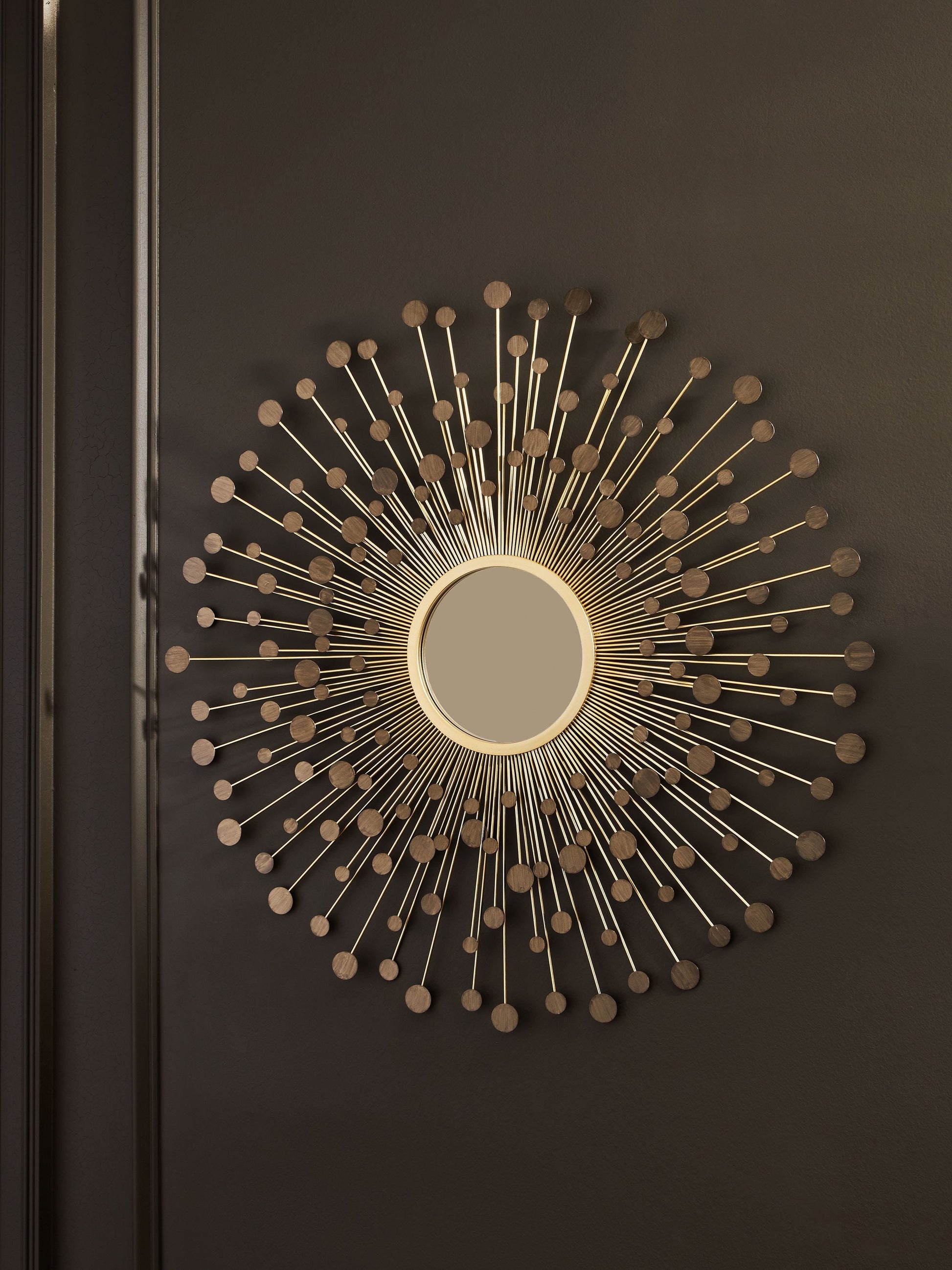 Light and bright, this accent mirror is a trendy take on wall decor. Its metallic spokes splay outward to create a sculpture-like frame. With goldtone and bronze-tone finishes, the piece is a reflection of your eye for contemporary design.